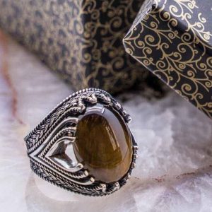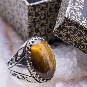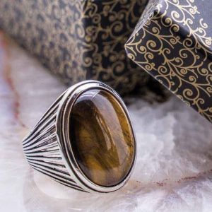 The male Tiger Eye stone comes in many different shapes. Shapes like oval Tiger eye stone, flat Tiger eye stone. You can access hundreds of models such as Ottoman Design, Sword Design, Vintage Design, Plain Design Tiger Eye Rings on our site.