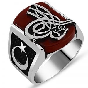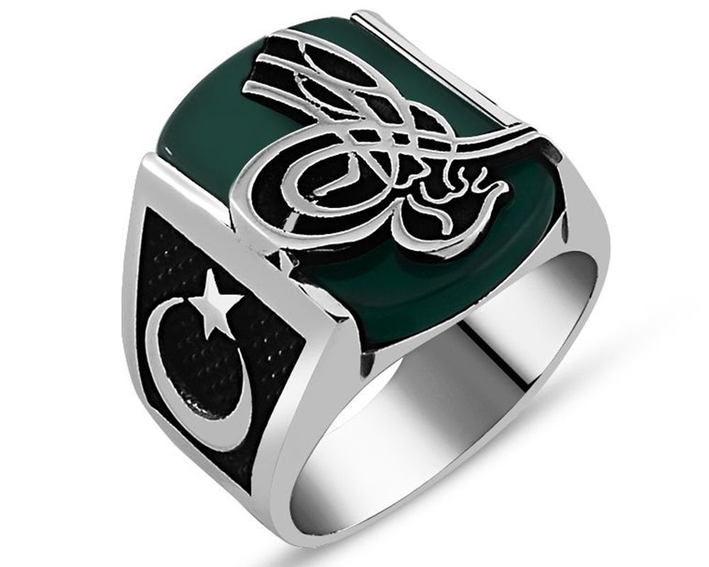 925 Sterling Silver Ring for Men with Green Agate Stone and Ottoman Sign
